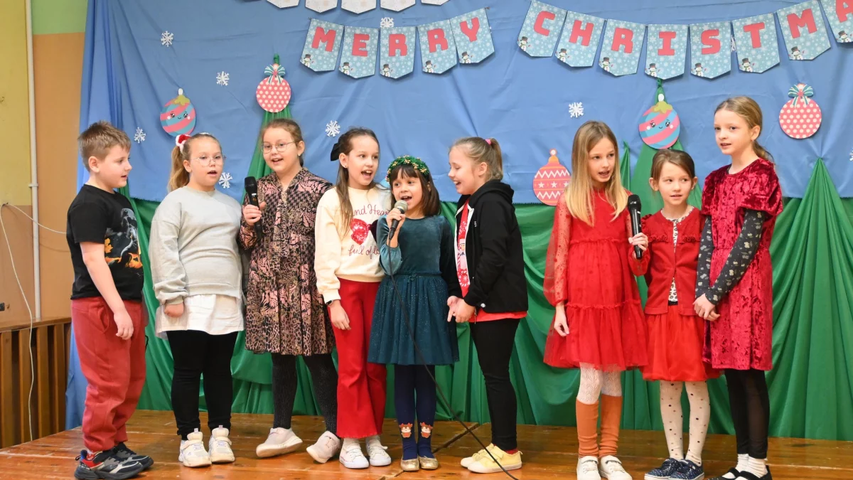 Na scenie zaprezentowali się uczniowie klas młodszych i starszych, wykonując znane i lubiane świąteczne utwory w języku angielskim. Wśród nich nie zabrakło takich przebojów jak „Jingle Bells” czy „We Wish You a Merry Christmas”. Artyści skutecznie wprowadzili widownię w świąteczny nastrój, co było widać po gromkich brawach i wspólnym śpiewaniu kolejnych piosenek.