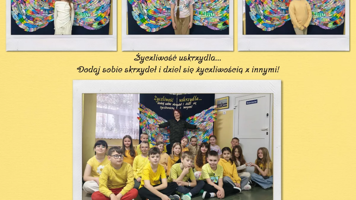 Z tej okazji uczniowie ubrali się w żółte barwy i wykonali pamiątkowe zdjęcia przy specjalnej ściance z okazjonalnych prac, przygotowanej przez Panią Elizę Rudnicką.