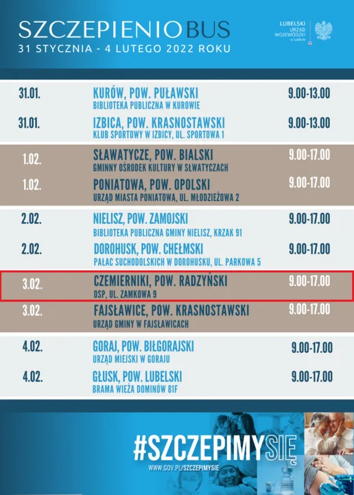 Tego dnia, w godzinach od 9:00 do 17:00, przy budynku Ochotniczej Straży Pożarnej w Czemiernikach będzie funkcjonował mobilny punkt szczepień (szczepieniobus), w którym wszyscy zainteresowani będą mogli zaszczepić się jednodawkowym preparatem Johnson&Johnson, bez wcześniejszego umawiania się czy zapisywania na konkretną godzinę. Wystarczy zabrać ze sobą dowód osobisty. Szczepienia przeciw COVID–19 to jedyny sposób na pokonanie pandemii i powrót do normalności.