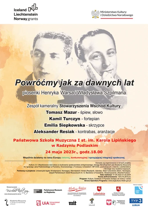 „Powróćmy jak za dawnych lat” jest częścią projektu „KULTURA 3.0. - Współczesna rola kultury w budowaniu społeczeństwa zintegrowanego” realizowanego w ramach Funduszy Norweskich. Koncerty zostały objęte Honorowym Patronatem Marszałka Województwa Lubelskiego - Jarosława Stawiarskiego i promują Lubelszczyznę na arenie międzynarodowej w ramach programu „Warto być Polakiem”. Patronami medialnymi wydarzeń są Polskie Radio Lublin i TVP3 Lublin, a partnerem merytorycznym zadania jest Państwowe Muzeum na Majdanku. Wstęp na koncert jest bezpłatny. Liczba miejsc ograniczona. Zapraszamy.