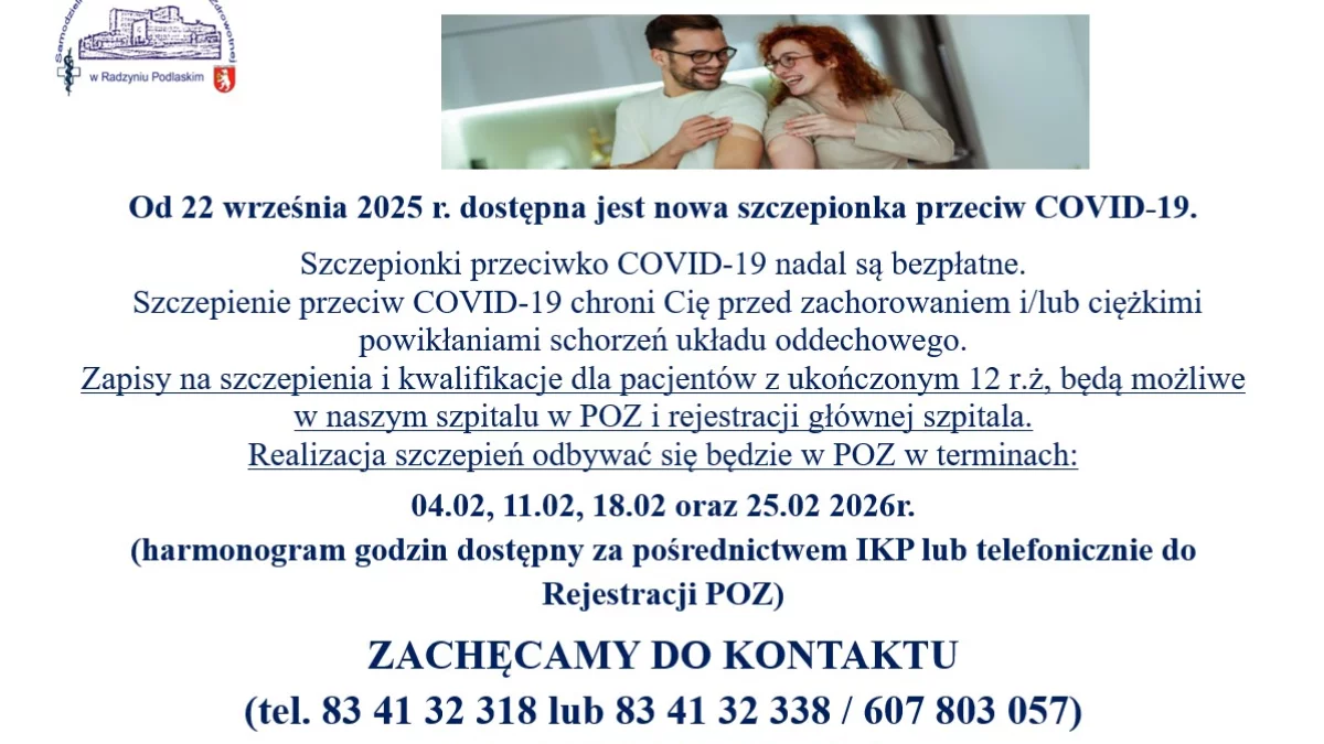 Szczepienie przeciw COVID-19 ma na celu ochronę przed zachorowaniem oraz przed ciężkim przebiegiem choroby i powikłaniami układu oddechowego. Zapisy na szczepienia oraz kwalifikacje pacjentów prowadzone są w poradni POZ oraz w rejestracji głównej szpitala.