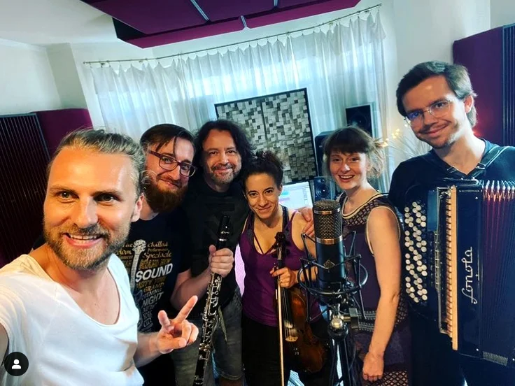 Fot. ( L.U.C.Rostkowski, officjal Istagram) Szymon Lipiński (pierwszy z prawej) i muzycy podczas sesji nagraniowej muzyki do filmu "Chłopi" w reżyserii DK Welchman. Razem z nim w studiu nagrywali również Marcin Janek na klarnecie, Michał Bąk na kontrabasie, Tomasz Chyła na skrzypcach oraz zespół Sutari, czyli trzy skrzypaczki śpiewające białym głosem