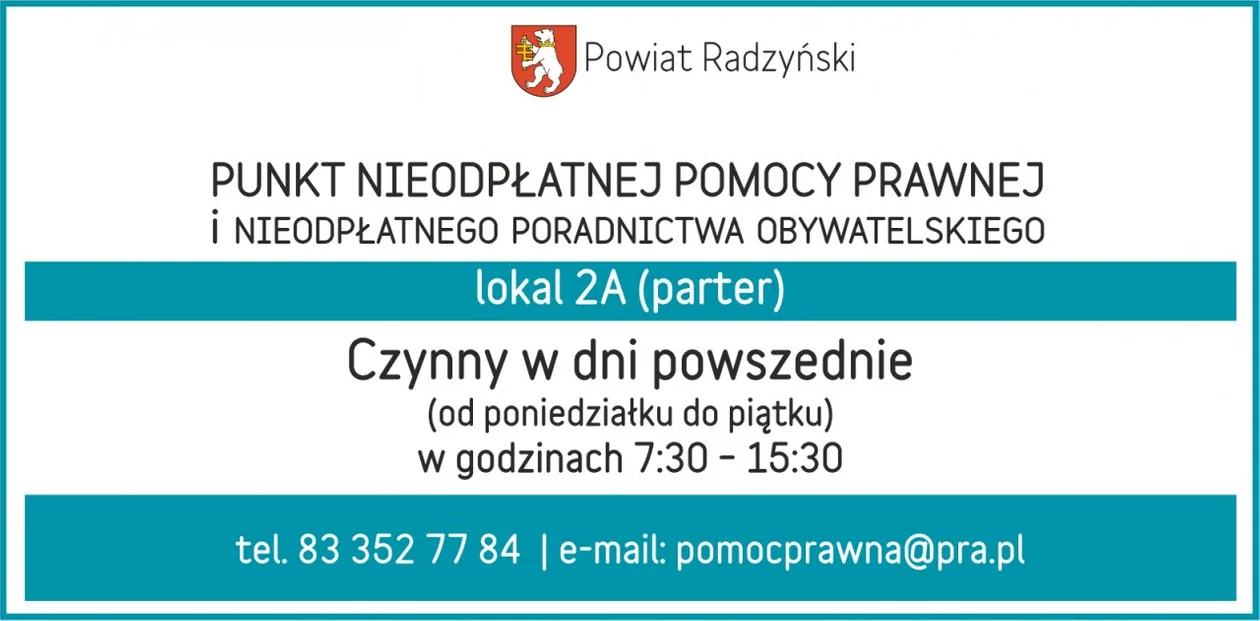 Informacje radzyńskiePowiat rozstrzygnął konkurs na prowadzenie punktu nieodpłatnej pomocy prawnej w 2023 r. Konkurs wygrało Stowarzyszenie Sursum Corda z Nowego Sącza. Otrzymało na to zadanie 64 tys. zł. Będzie prowadziło nieodpłatną pomoc prawną, poradnictwo obywatelskie, mediacje i edukację prawną. Punkt działa od poniedziałku do piątku w godz. 7. 30 do 15. 30, na parterze w lokalu 2 A w Starostwie Powiatowym. Tel. 83 352 77 84.