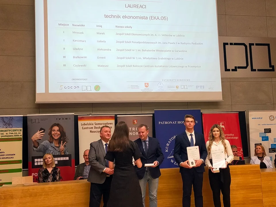 Konferencję rozpoczęła Pani Bożena Jarmuł oraz Pan Jacek Misiuk. Następnie Pan dr hab. Radosław Brzózka odczytał list Ministra Edukacji i Nauki skierowany do organizatorów i uczestników Olimpiady. W dalszej części głos zabrali organizatorzy Olimpiady i zaproszeni goście, którzy podkreślali, jak dużym osiągnięciem młodzieży są tytuły laureatów i finalistów Ogólnopolskiej Olimpiady Zawodowej „Rok przed Dyplomem” oraz zwracali uwagę na potrzebę wzmacniania i zwiększania poziomu kształcenia zawodowego w Polsce. Podczas konferencji ogłoszono wyniki Olimpiady i podsumowano jej przebieg. W centralnym etapie uczestniczyło 212 uczniów, 119 zespołów reprezentujących 53 szkoły techniczne z 30 miejscowości w 9 województwach. Uczniowie sprawdzali swoją wiedzę w 17 kwalifikacjach zawodowych. Wyłoniono 68 laureatów i 144 finalistów, wśród których uczniowie Zespołu Szkół Ponadpodstawowych im. Jana Pawła II w Radzyniu Podlaskim stanowili najbardziej liczną grupę. Uczniowie naszej szkoły startowali w siedmiu kwalifikacjach zawodowych i we wszystkich uzyskali miejsca na podium. Lista nagrodzonych uczniów ZSP wraz z opiekunami: Technik budownictwa (BUD.14): II miejsce - Szymon Wierzchowski (laureat) kl. 4tbmp II miejsce - Bartłomiej Kostrzewa (laureat) kl. 4tbmp III miejsce - Mateusz Zakrzewski (laureat) kl. 4 tbmp Nauczyciel przygotowujący do Olimpiady: Ewelina Kozyra-Sikorska Technik ekonomista (EKA.05): I miejsce - Izabela Karczmarz (laureat) kl. 4telp Finalista - Dominika Krzyżanowska kl. 4telp Nauczyciel przygotowujący do Olimpiady: Anna Gryta Technik hotelarstwa (HGT.06): III miejsce - Julia Grzeszczuk (laureat) kl. 4tshp Finalista - Aleksandra Mackiewicz kl. 4tshp Nauczyciel przygotowujący do Olimpiady: Ewa Nestorowicz Technik informatyk (INF.03): I miejsce - Piotr Piasko (laureat) kl.4tip Finalista - Kacper Chomiuk kl. 4 tip Nauczyciel przygotowujący do Olimpiady: Agnieszka Frączek Technik logistyk (SPL.04): II miejsce - Bartłomiej Rola (laureat) kl. 4telp Finalista - Jakub Kołtun kl. 4telp Finalista - Aleksandra Kulik kl. 4telp Nauczyciel przygotowujący do Olimpiady: Renata Stefaniak Technik usług fryzjerskich (FKR.03): I miejsce - Julia Mościbrodzka (laureat) kl. 4tfgp II miejsce - Paweł Goliński (laureat) kl. 4tfgp II miejsce - Emilia Steć (laureat) kl. 4tfgp Nauczyciel przygotowujący do Olimpiady: Katarzyna Magier, Monika Mazur Technik żywienia i usług gastronomicznych (HGT.12): III miejsce - Katarzyna Wójcik (laureat) kl. 4tfgp Finalista - Joanna Szwed kl. 4tfgp Finalista - Kacper Krupski kl. 4tfgp Nauczyciel przygotowujący do Olimpiady: Monika Kitlińska Dwoje laureatów ZSP Izabela Karczmarz i Piotr Piasko zajęli I miejsce i otrzymało „Indeksy Politechniki Lubelskiej”, co gwarantuje im przyjęci na I rok studiów Politechniki Lubelskiej z pominięciem warunków postępowania kwalifikacyjnego.