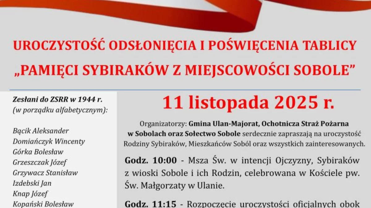 Obchody rozpoczną się o godzinie 10:00 Mszą Świętą w Kościele pw. Św. Małgorzaty w Ulanie, odprawioną w intencji Ojczyzny oraz Sybiraków z Soból i ich rodzin. Następnie, o godzinie 11:15, przewidziano część oficjalną przy Centrum Społeczno-Kulturalnym w Sobolach (Sobole 35).