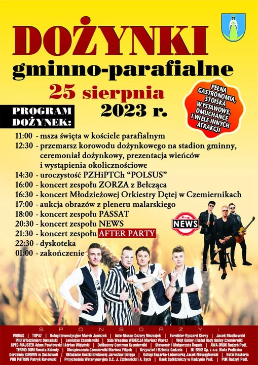 Informacje radzyńskie- Zapraszamy wszystkich serdecznie na Dożynki Gminne, które tradycyjnie odbędą się w odpust 25 sierpnia 2023r (piątek). Gwiazdą wieczoru będzie After Party -- zaprasza wójt Arkadiusz Filipek. Szczegóły na plakacie.