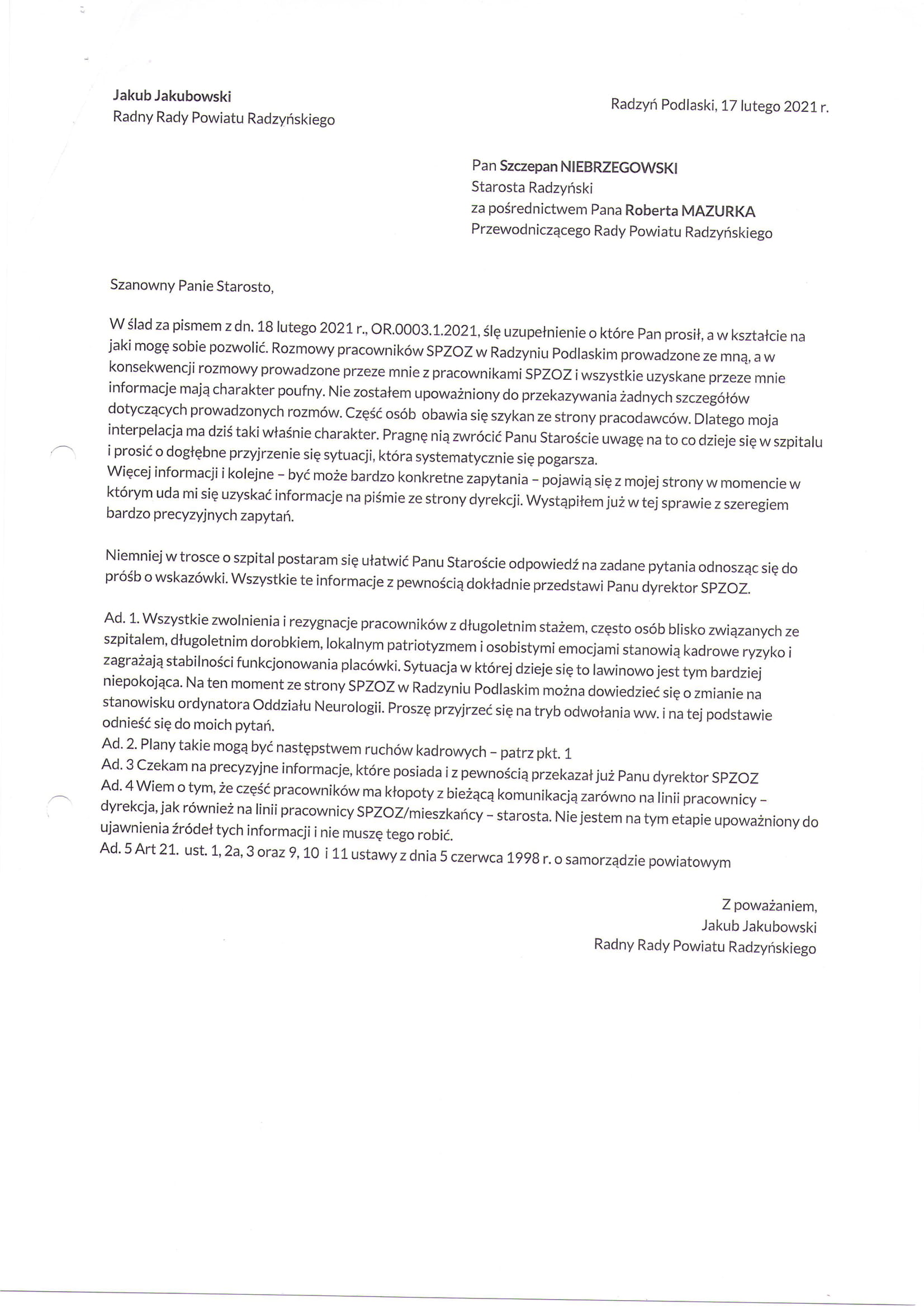 Szczepan Niebrzegowski poprosił Jakubowskiego o uzupełnienie interpelacji. – Proszę o doprecyzowanie pytań i odniesienie się do konkretów – stwierdził starosta i dodał, że przedstawiona przez radnego "uogólniona, subiektywna opinia, wykrzywia działania powiatu i jest nieuprawniona".