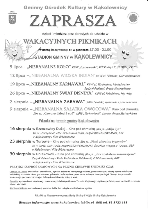Informacje radzyńskieGminny Ośrodek Kultury w Kąkolewnicy zaprasza wszystkich chętnych do uczestnictwa w Wakacyjnych Piknikach, które będą odbywać się na terenie stadionu gminnego w Kąkolewnicy.