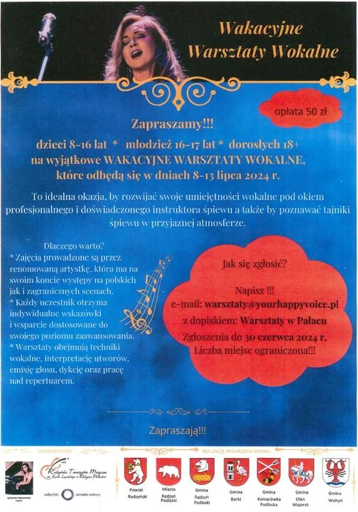 Warsztaty prowadzone będą od 8.07. do 12.07.2024 r. w Izbie Pamięci Karola Lipińskiego mieszczącej się w siedzibie Radzyńskiego Towarzystwa Muzycznego (w Pałacu Potockich ul. Jana Pawła II 2 ). Zakończymy je 13.07.2024 r. Koncertem finałowym, podczas którego wokaliści zaprezentują efekty swojej pracy. Projekt wspierają finansowo: Powiat Radzyński, Miasto Radzyń Podlaski oraz Gminy: Radzyń Podlaski, Borki, Komarówka Podlaska, Ulan-Majorat i Wohyń. Koszt uczestnictwa to tylko 50 zł. Zgłoszenia przyjmujemy do 30 czerwca 2024 r. na e-mail: warsztaty@yourhappyvoice.pl z dopiskiem: Warsztaty w Pałacu. Liczba miejsc ograniczona!!!