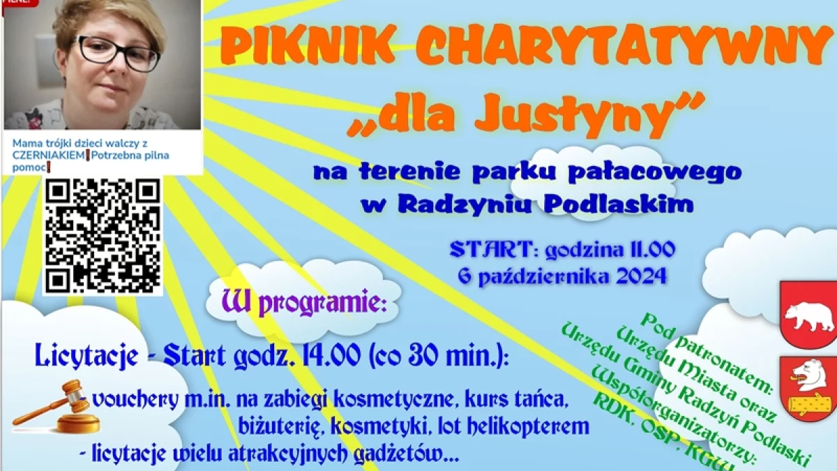6 października na terenie Parku Pałacowego w Radzyniu Podlaskim organizowany jest PIKNIK CHARYTATYWNY „dla Justyny”. W programie przewidziano wiele atrakcji: -Licytacje: Start godz. 14.00 (co 30 minut) vouchery m.in. na zabiegi kosmetyczne, kurs tańca, zakupy w wielu branżowych sklepach, biżuteria, kosmetyki, lot helikopterem oraz wielu innych atrakcyjnych gadżetów.