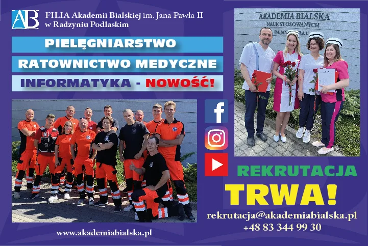 Akademia Bialska Nauk Stosowanych w Białej Podlaskiej w swojej filii mieszczącej się w Zespole Szkół Ponadpodstawowych im. Jana Pawła II w Radzyniu Podlaskim ogłosiła otwarcie nowego kierunku studiów - Informatyka. W odpowiedzi na rosnące zapotrzebowanie na specjalistów z zakresu technologii informacyjno-komunikacyjnych, Polska Komisja Akredytacyjna wyraziła zgodę na tę inicjatywę, umożliwiając młodym umysłom zdobycie wiedzy i umiejętności w tej dynamicznie rozwijającej się dziedzinie. Serdecznie zapraszamy wszystkich zainteresowanych kandydatów do wzięcia udziału w pierwszej rekrutacji na kierunek Informatyka w radzyńskiej filii Akademii Bialskiej. Uczelnia zapewnia doskonałe warunki nauki, wykwalifikowaną kadrę akademicką oraz zaplecze techniczne. Nie musisz nigdzie wyjeżdżać, by studiować swój wymarzony kierunek. Nie czekaj, weź udział w rekrutacji!