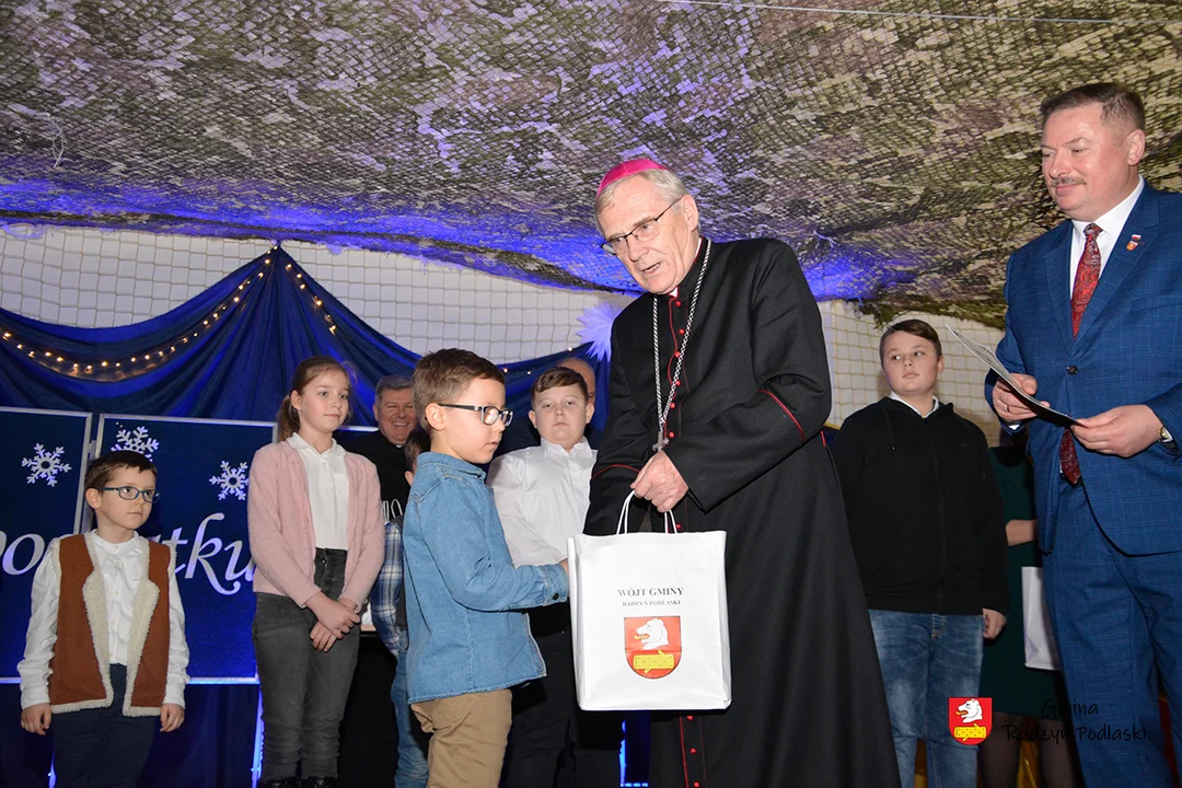 Po przemowach przyszedł czas na wspólną modlitwą pod przewodnictwem biskupa Kazimierza Gurdy. Po tradycyjnym przełamaniu się opłatkiem uczestnicy spotkania zostali zaproszeni do świątecznego obiadu, który składał się z tradycyjnych potraw wigilijnych: barszczu z uszkami, ryby oraz pierogów z kapustą i grzybami. W nastrój refleksji i zadumy nad prawdziwym sensem Świąt Bożego Narodzenia wprowadziła uczestników spotkania orkiestra dęta z Tomaszem Nurzyńskim na czele. Następnie wszyscy kolędowali razem z uczniami gminnych szkół, którzy byli zwycięzcami XI gminnego konkursu kolęd i pastorałek "Wesoła nowina". Pragniemy podziękować wszystkim przybyłym gościom za wspólną modlitwę oraz mile spędzony czas. K - orzystając z okazji pragniemy złożyć wszystkim życzenia zdrowych i wesołych Świąt Bożego Narodzenia oraz wszelkiej pomyślności w nadchodzącym Nowym Roku! - zyczy wszytskim Gmina Radzyń Podlaski.