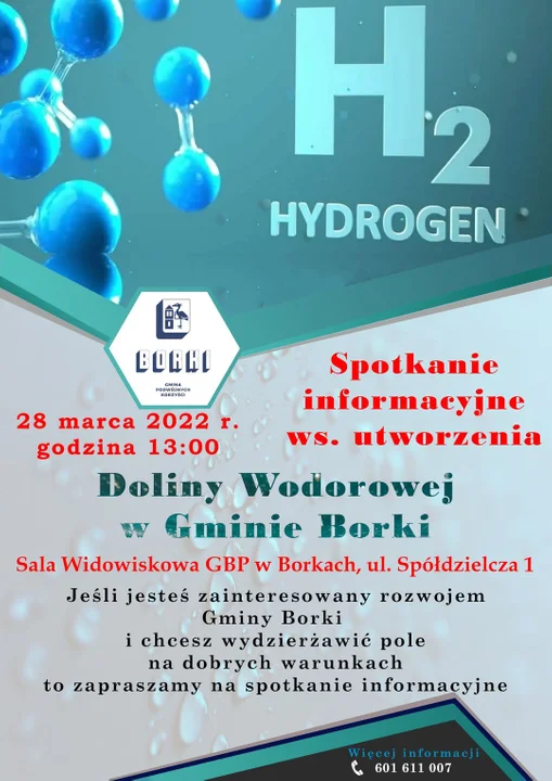 Wójt zaprasza wszystkie zainteresowane projektem osoby na spotkanie ws. utworzenia doliny wodorowej. - Jeśli jesteś zainteresowany rozwojem Gminy Borki i chcesz wydzierżawić pole na dobrych warunkach to zapraszamy na spotkanie informacyjne - zachęca.