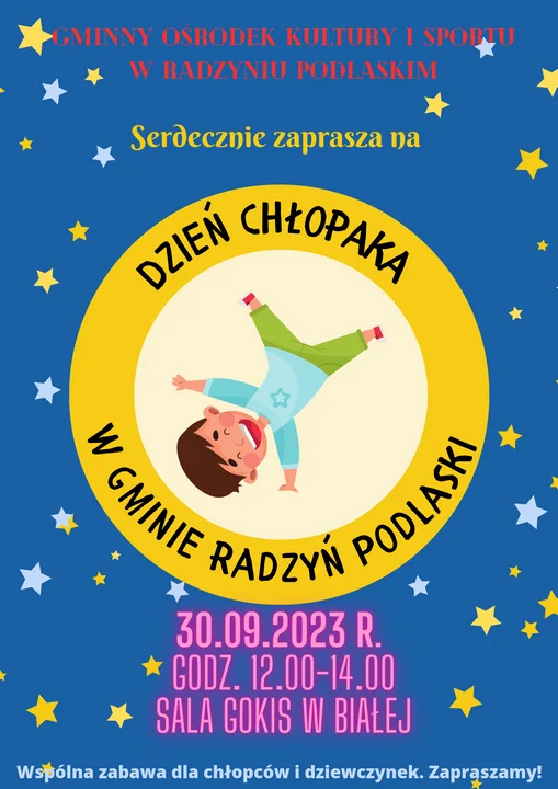 Gminny Ośrodek Kultury i Sportu w Radzyniu Podlaskim serdecznie zaprasza wszystkie dzieci z gminy na obchody Dnia Chłopaka! Spotykamy się 30.09.2023 r. w sali GOKiSu w Białej. Mile widziane przebrania w stroje superbohaterów (chłopcy) i księżniczki (dziewczynki). Wspólnie wykonamy prace plastyczne, będą tańce i wspólne zabawy. Przygotujemy również fotobudkę, w której wykonamy pamiątkowe zdjęcia.