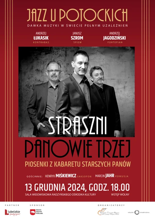 Informacje radzyńskieRadzyński Ośrodek Kultury zaprasza na zupełnie wyjątkowe wydarzenie, koncert ,, Straszni Panowie Trzej". Projekt jest współfinansowany przez Lubelskie. Smakuj życie! W koncercie ( za free) wystąpią znakomici wokaliści i jazzmani. W imieniu organizatorów serdecznie polecamy i zapraszamy !
