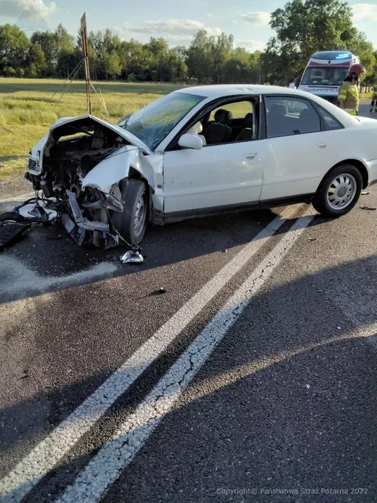 Samochód osobowy marki Toyota Avensis wylądował w przydrożnym rowie. W środku znajdowały się dwie kobiety, których uwolnili z samochodu strażacy. Obie kobiety były przytomne. Drogę krajową i przejazd w obu kierunkach blokował samochód marki Audi. Po zderzeniu – zarówno kierowca i jak pasażer opuścili samochód o własnych siłach. Na miejscu pojawiły się dwa zastępy JRG , dwie karetki pogotowia i policja. Trwa wyjaśnianie zdarzenie. Prawdopodobną przyczyną zderzenia samochodów było wymuszenie przez kierowcą audi pierwszeństwa przejazdu podczas skrętu do stacji paliwowej