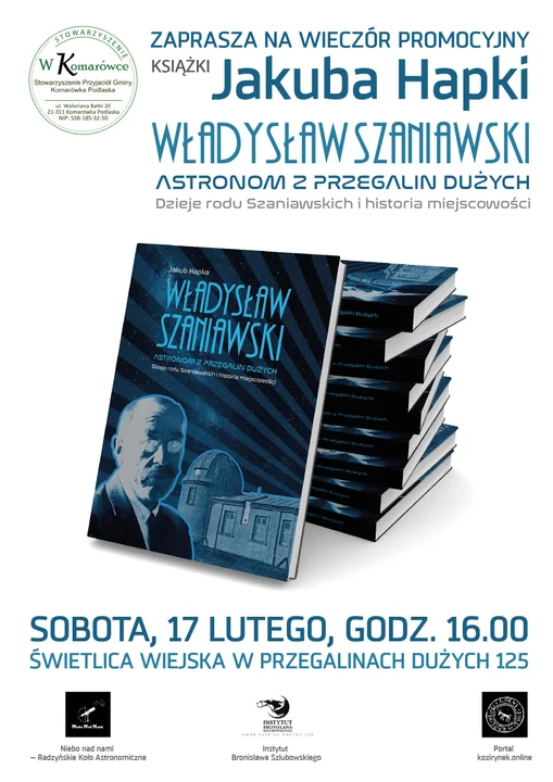 -Wszystko zaczęło się w Walentynki 2023 r. - wspomina Hapka. - Prezes stowarzyszenia "W Komarówce", Dorota Korszeń zwróciła się do Adama Świcia z prośbą o znalazienie kogoś, kto podjąłby się zebrania informacji o jednym z najwybitniejszych mieszkańców powiatu radzyńskiego – Władysławie Szaniawskim. -Wuj wskazał moją osobę i tego dnia przekazał mi pierwsze materiały – archiwa gromadzone przez pana Grzegorza Grzesiakowskiego z Koła Historycznego w Komarówce Podlaskiej – opisuje proces powstawania publikacji – Nieocenioną pomocą była opublikowana w 2005 r. książka byłego mieszkańca wsi, Wacława Makaruka – "Obrazki z mojej ziemi podlaskiej" oraz wspomnienia wnuczek astronoma, Teresy Adamczyk i Barbary Szaniawskiej w zbiorach Muzeum Ziemiaństwa w Dobrzycy- dodaje.