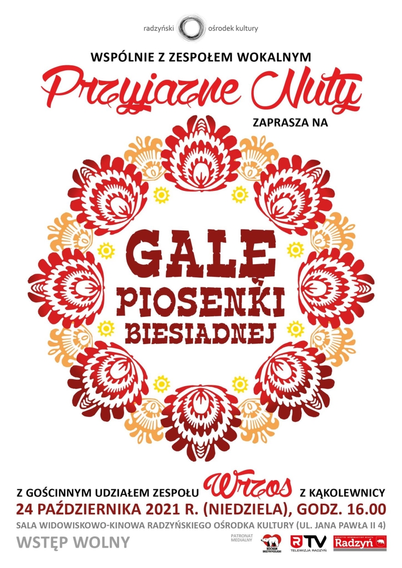 Informacje radzyńskieRadzyński Ośrodek Kultury wspólnie z Zespołem Wokalnym "Przyjazne Nuty" zaprasza na Galę Piosenki Biesiadnej. Wydarzenie odbędzie się w niedzielę 24 października o godz. 16.00 w sali widowiskowo-kinowej ROK. Wstęp wolny.