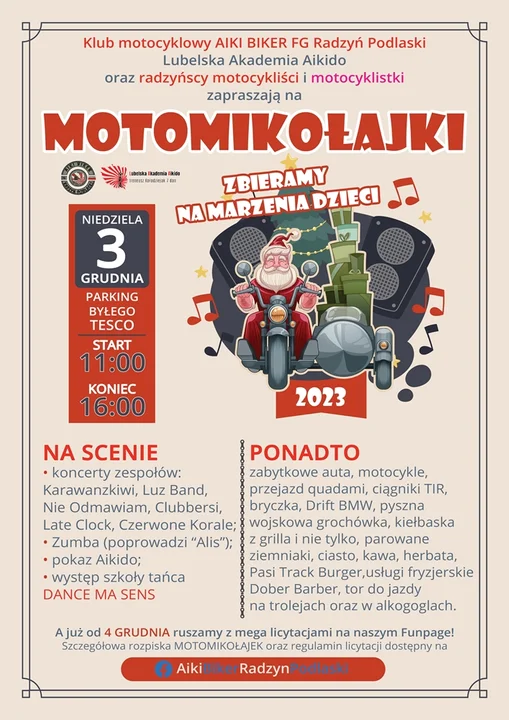 Poprzedni rok pokazał, że ludzie chcą pomagać a dzięki przeprowadzonym rozmowom z jednostkami MOPS i GOPS okazało się, że jest komu. Kupiliśmy łóżka, ciepłe ubrania i buty, biurka, krzesła, artykuły szkolne – wyjaśnia Karol Niewęgłowski, koordynator wydarzenia. Jak dodaje wiceprezydent grupy Jacek Patkowski, na scenie wystąpią niezawodni przyjaciele ale i zespoły, które po raz pierwszy zawitają do Radzynia. - Jak zawsze zobaczymy niezawodnego Wojtka Molasa Gila z całym swoim zespołem LUZ BAND, przyjadą także do nas goście z Parczewa o tajemniczej nazwie KARAWANZKIWI, nie zabraknie przedstawicieli muzyki rozrywkowej – Panowie z formacji Clubbersi, nasi klubowi bracia, którzy także chwycili za gitary i wystąpią pod nazwą NIE ODMAWIAM, wystąpi piękna i uzdolniona radzynianka mieszkająca obecnie w Warszawie Sylwia Drabik z zespołem LATE CLOCK oraz z ludową nutą zaprezentuje się zespół CZERWONE KORALE z Zabiela. Organizatorzy także dla właścicieli jednośladów przygotowali na ten dzień niespodziankę. Dzięki uprzejmości Krzysztofa Hryciuka, właściciela Biura Ubezpieczeniowego, do zgarnięcia będzie zupełnie za darmo całoroczne ubezpieczenie dla jednośladu. Nagrodę zdobędzie właściciel najciekawiej ubranego świątecznie motocykla. Pod sceną i wokół niej również będzie się dużo działo.
