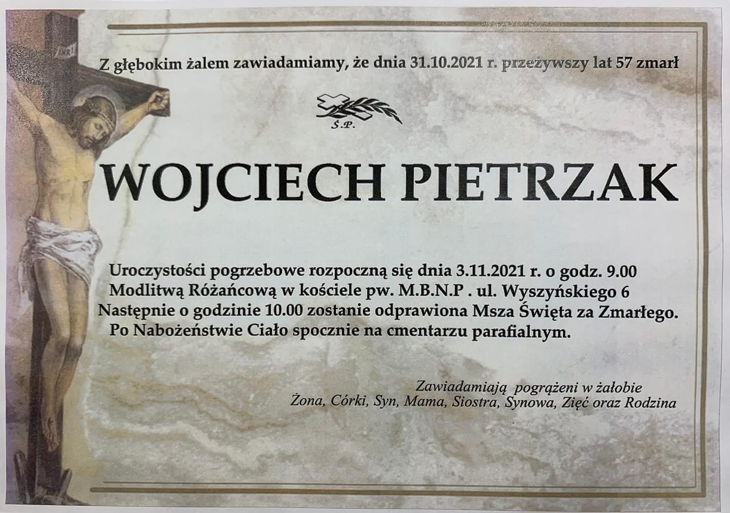 Informacje radzyńskie Z niedowierzaniem radzyniacy przyjmują wiadomość o nagłej śmierci Wojciecha Pietrzaka, syna śp. Zygmunta Pietrzaka, wspaniałego męża, ojca. Pod nekrologiem opublikowanym przez córkę Paulinę i słowami : ,,Serce nam pękło " pojawiają się wciąż kondolencje :- Wyrazy współczucia dla całej rodziny.