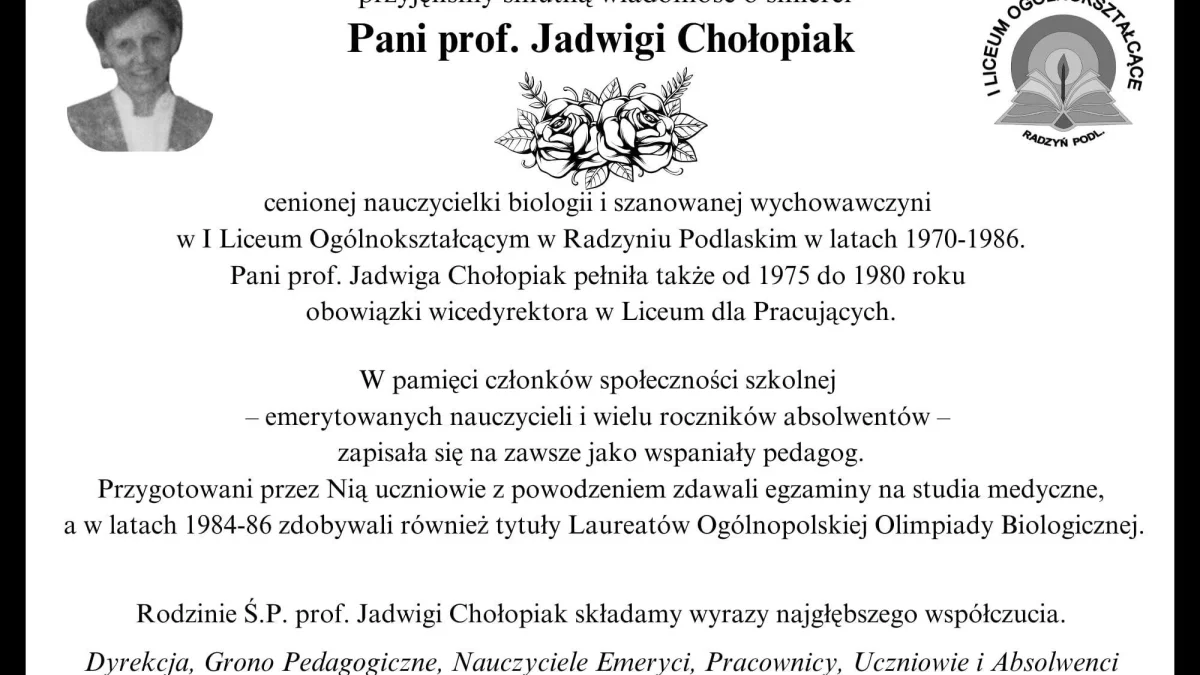 Pani Jadwiga Chołopiak pozostawiła po sobie trwały ślad w historii radzyńskiego szkolnictwa.