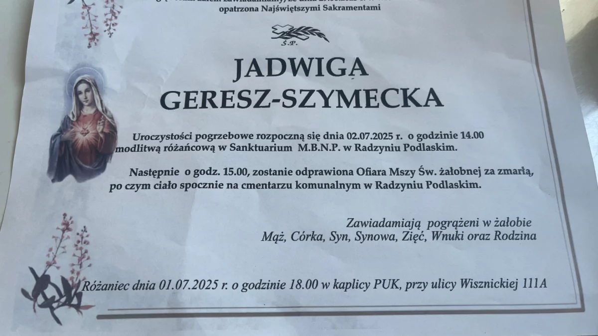 O 15:00 odprawiona zostanie Msza Św. żałobna za zmarłą, po czym ciało spocznie na cmentarzu komunalnym w Radzyniu Podlaskim.