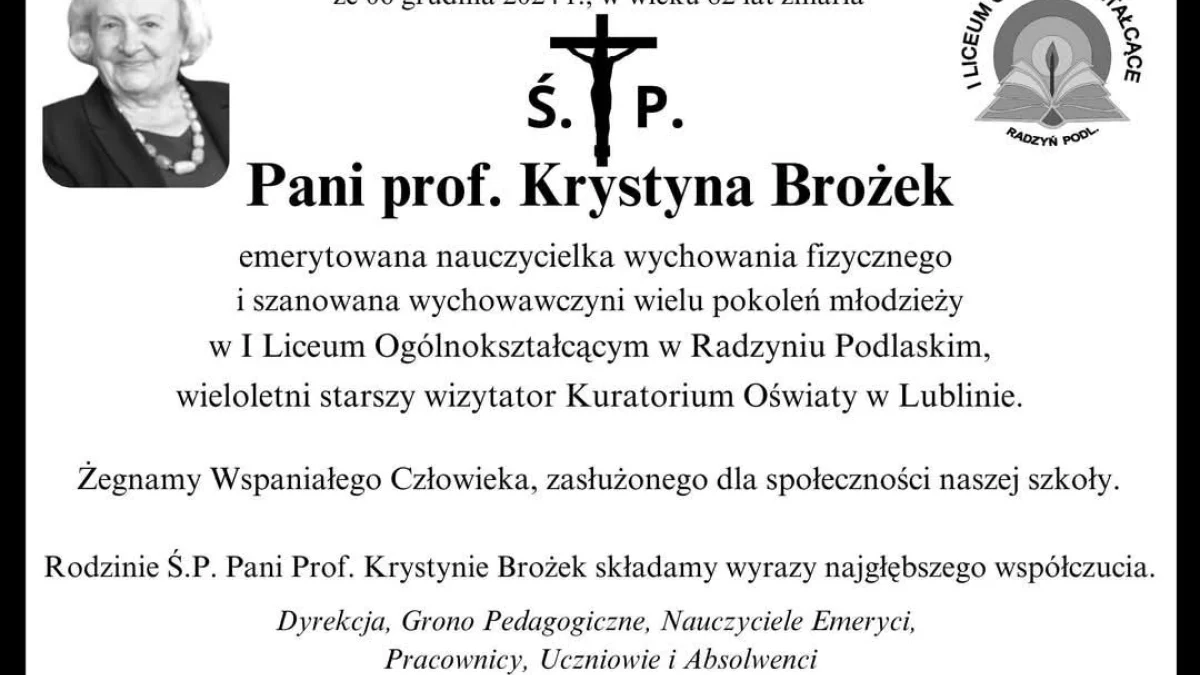 Informacje radzyńskieMsza Św. żałobna zostanie odprawiona 9 grudnia , o godz. 10. w Kościele p.w. Trójcy Św. w Radzyniu Podlaskim, poprzedzona modlitwą różańcową w intencji Zmarłej o godz. 9.15 - informuje Ewa Grodzka, dyrektor I LO.