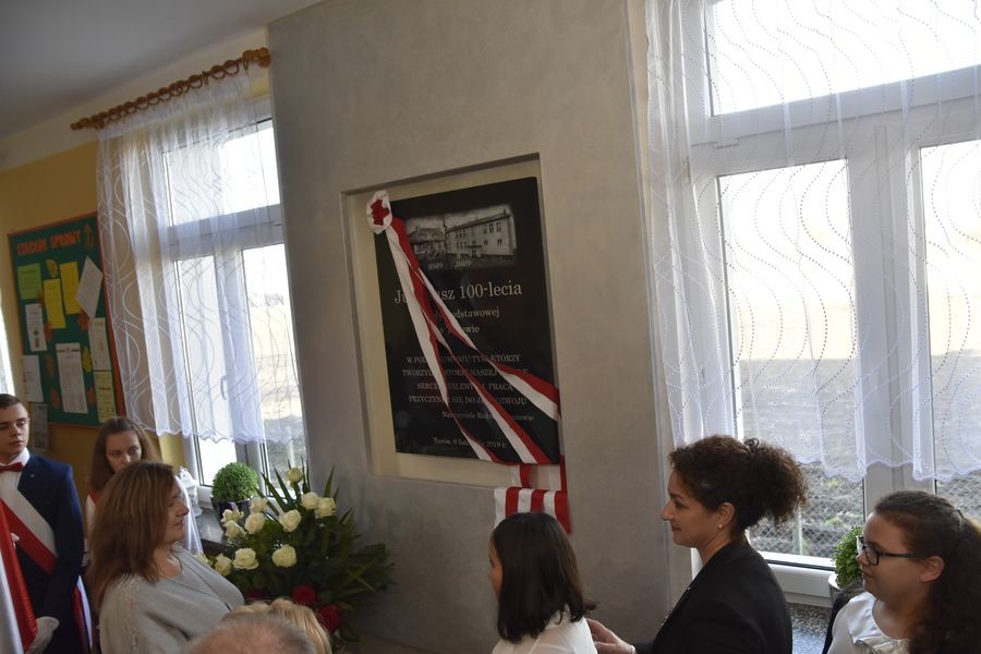 Następnie goście przeszli do budynku szkoły, gdzie poświęcono tablicę pamiątkową. Część artystyczną rozpoczęto uroczystym odśpiewaniem hymnu. Dyrektor Agnieszka Gawryluk przedstawiła historię szkoły. W dalszej kolejności nastąpiły przemówienia zaproszonych gości, a po nich występy uczniów. W międzyczasie była okazja zwiedzić budynek szkoły. Na miejscowym cmentarzu zapalono znicze pamięci na mogiłach nauczycieli.