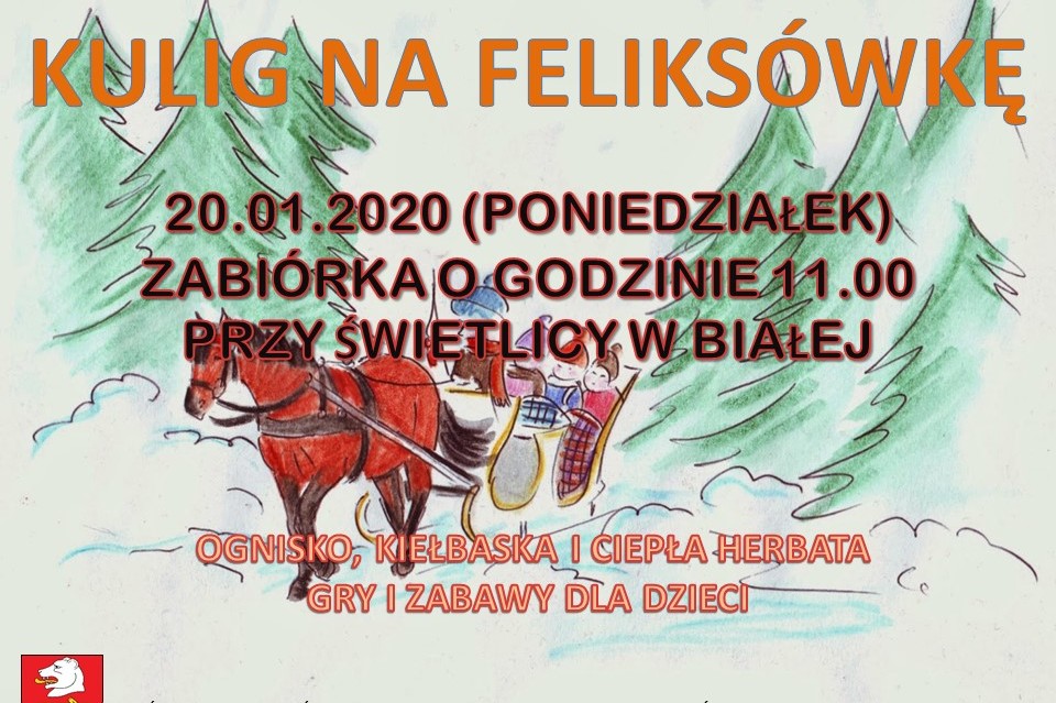 W poniedziałek, 20 stycznia planowany jest kulig do Felksówki - zbiórka o godzinie 11.00, przy świetlicy w Białej. Przewidziane gry zabawy, pieczenie kiełbasek na ognisku.