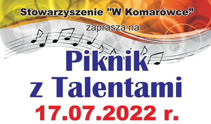 Kulturae Stowarzyszenie "W Komarówce" zaprasza na Piknik z Talentami, podczas którego chętni zaprezentują swoje umiejętności taneczne, wokalne, instrumentalne, literackie, artystyczne i sportowe. Więcej szczegółów na plakacie.