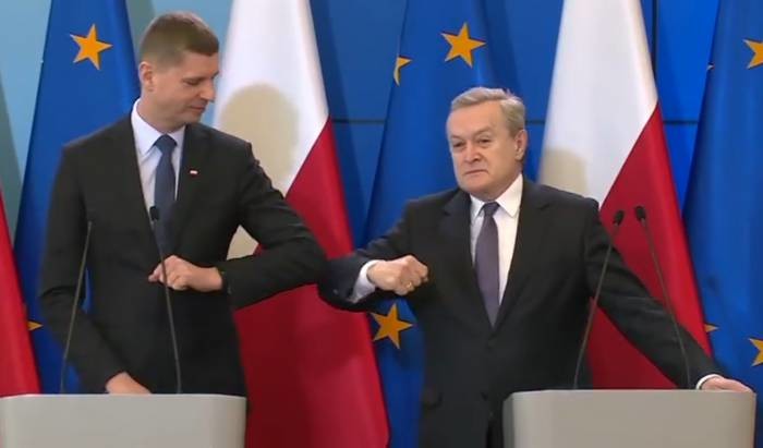 - Nasze zachowania muszą się zmienić, np. jeśli chodzi o podawanie ręki - powiedział, po czym do spółki z ministrem edukacji narodowej zaprezentował osobliwy gest - zamiast podać sobie ręce oficjele... styknęli się łokciami.