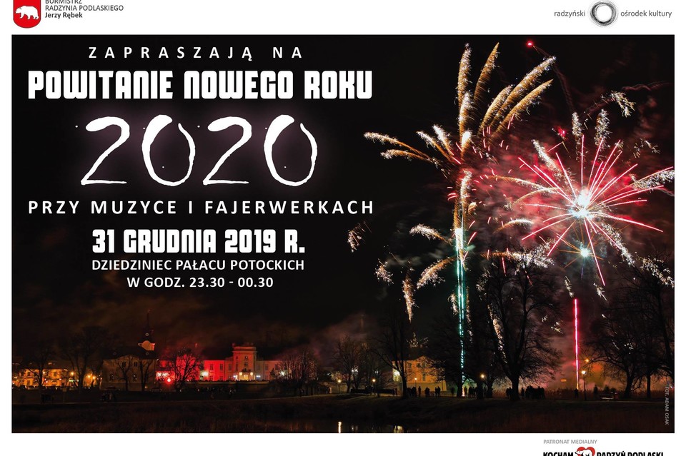 KulturaBurmistrz Jerzy Rębek oraz Radzyński Ośrodek Kultury zapraszają na powitanie Nowego Roku 2020 przy muzyce i fajerwerkach. W Sylwestra na dziedzińcu Pałacu Potockich o godz. 23.30.