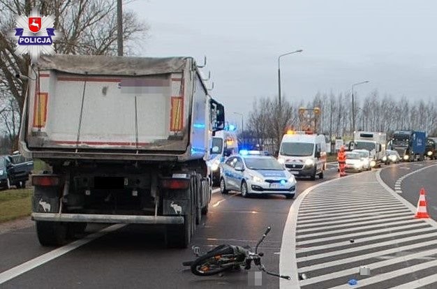 Do zdarzenia doszło wczoraj około godz. 5:20 w Radzyniu Podlaskim na drodze krajowej nr 19. Ze wstępnych ustaleń wynika, że 52-letni mieszkaniec Radzynia Podlaskiego jadący rowerem doprowadził do zderzenia z samochodem ciężarowym. Mężczyzna najprawdopodobniej skręcił w lewo, wjeżdżając wprost pod koła jadącego w tym samym kierunku samochodu ciężarowego m-ki Man wraz z naczepą. Ciężarówką kierował 33-letni mieszkaniec gm. Drelów. Cyklista w wyniku wypadku doznał obrażeń ciała i przewieziony został do szpitala.