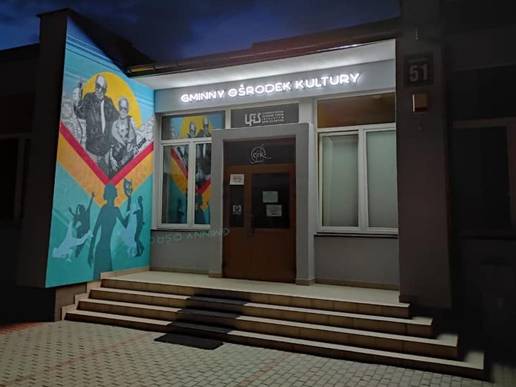 Wejście do ulańskiego GOK zdobi mural oraz neonowy szyld.
