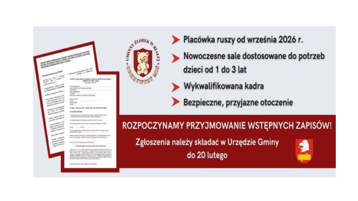 W związku ze zbliżającym się otwarciem żłobka rozpoczęto przyjmowanie wstępnych deklaracji zamiaru zapisania dziecka do tej placówki. Formularz można pobrać ze strony internetowej Gminy Radzyń Podlaski, który należy składać w sekretariacie Urzędu Gminy Radzyń Podlaski, ul. Warszawska 32 - w terminie do dnia 20 lutego br.