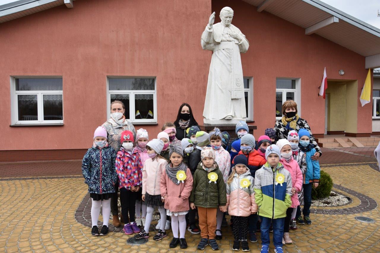 Podkreślił, że patron Św. Jan Paweł II to bardzo ważna postać w życiu szkoły. Wokół niego buduje się tradycje, wprowadza uczniów w świat wartości. Cała społeczność szkolna dokłada wszelkich starań, aby jego nauki były dla nas drogowskazem w pracy i w życiu. Zgromadzeni goście, delegacja dzieci z grup przedszkolnych oraz oddziały z klas „0” pod opieką wychowawczyń po wspólnej modlitwie złożyli kwiaty i zapalili znicze przed pomnikiem.