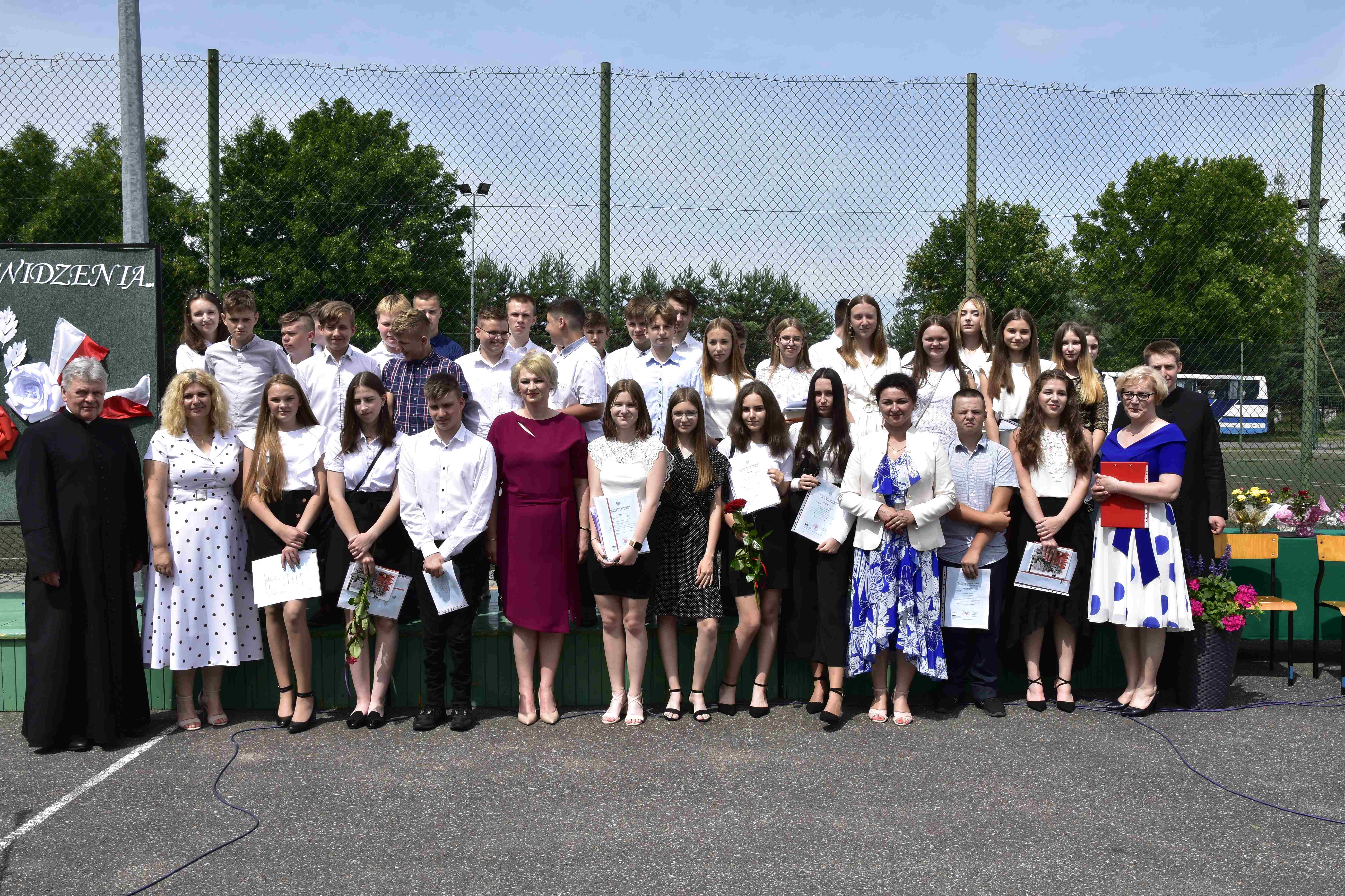 Wójt Anna Mróz wręczyła uczniom i nauczycielom podziękowania za reprezentowanie szkoły podczas uroczystości patriotycznych w lesie ,,Baran’’ oraz życzyła wszystkim wesołych i bezpiecznych wakacji. Część artystyczna została przygotowana przez uczniów klas VIII pod kierunkiem Elżbiety Marzyckiej i Kingi Oknińskiej. Podczas uroczystości Dyrektor ZO Iwona Chmielewska wręczyła uczniom klas VIII świadectwa ukończenia nauki w Szkole Podstawowej oraz świadectwa z wyróżnieniem, a także nagrody książkowe uczniom klas IV-VII.