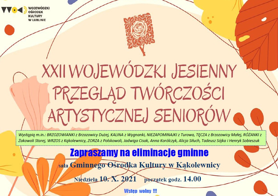 WiadomościGmina Kąkolewnica zaprasza w najbliższe dwie niedziele na eliminacje gminne XXII Wojewódzkiego Jesiennego Przeglądu Twórczości Artystycznej Seniorów (w niedzielę, 10 października o godz. 14.00 w GOK-u) oraz na koncert pieśni maryjnej "Ave Maryja" (17 października, o godz. 16.00 w parafii Św. Filipa Nerii w Kąkolewnicy).