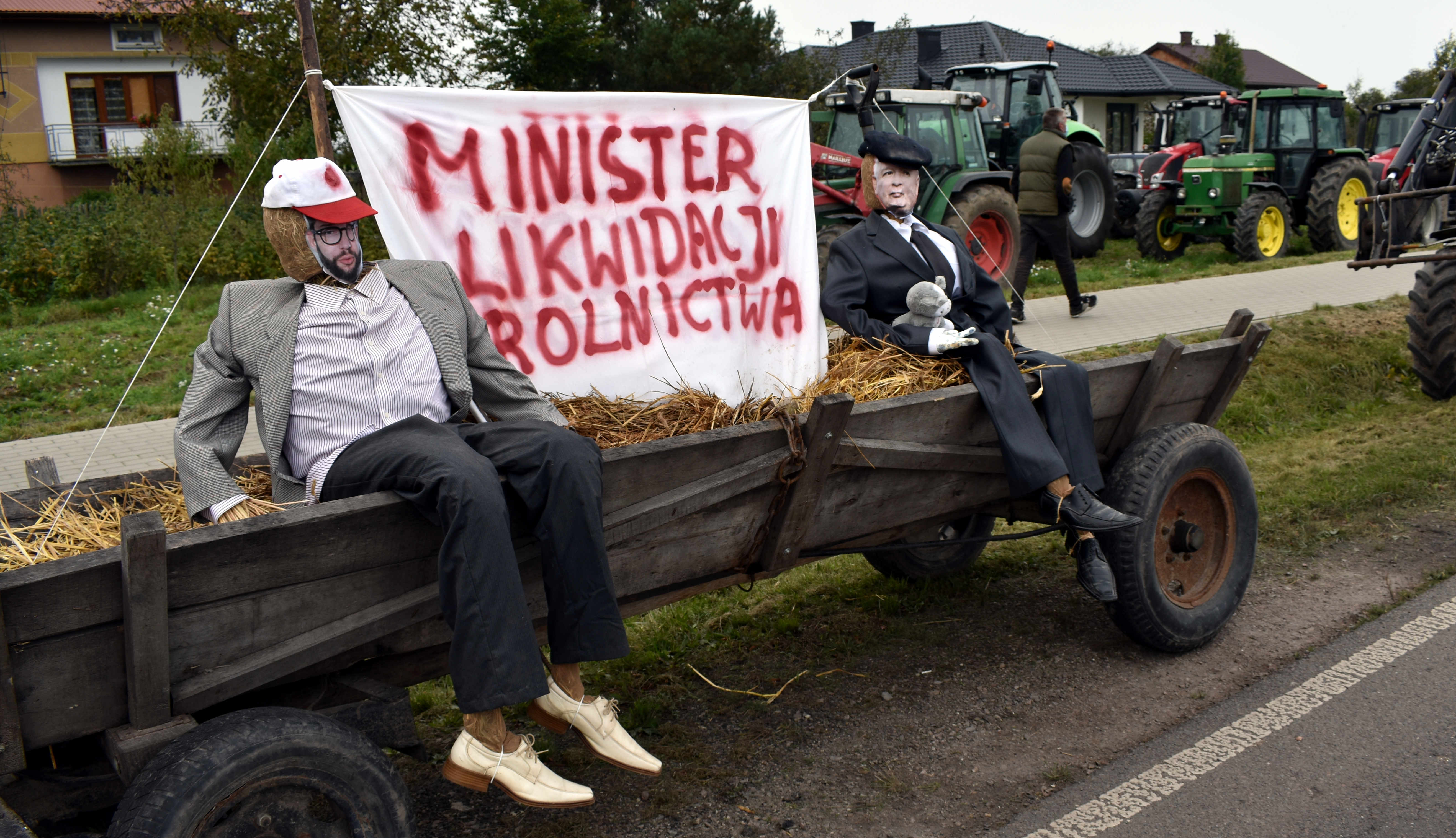 Do jednego z ciągników podczepiony był wóz. Na nim siedziały dwie kukły - ministra rolnictwa Grzegorza Pudy i prezesa PiS Jarosława Kaczyńskiego z kotem. To tych polityków rolnicy wzywają do wycofania się ze złych ich zdaniem rozwiązań.